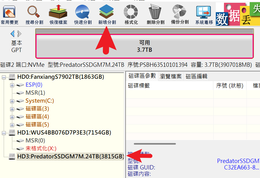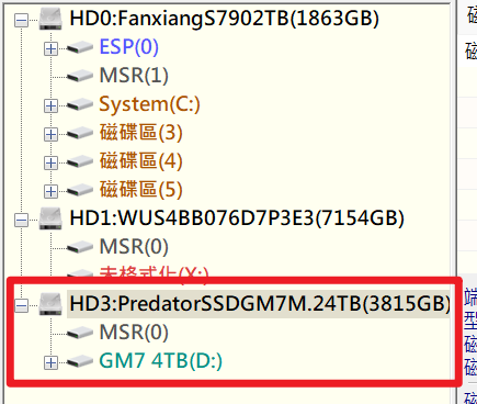 HD3是「目標」磁碟,型號為 Predator GM7,容量約 4TB。