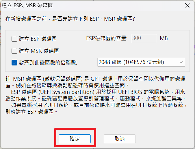 - 不需要建立 ESP/MSR 磁碟區,可以直接點確定。