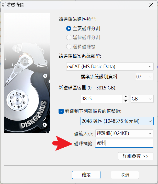 - 其他保持預設,可以給磁碟區命名,之後點擊確定。