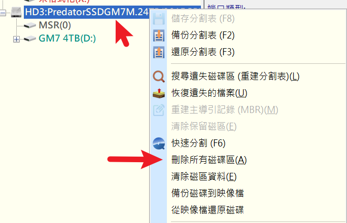 - 再次核對磁碟型號,對「目標」磁碟點擊右鍵,選擇刪除所有磁碟區。